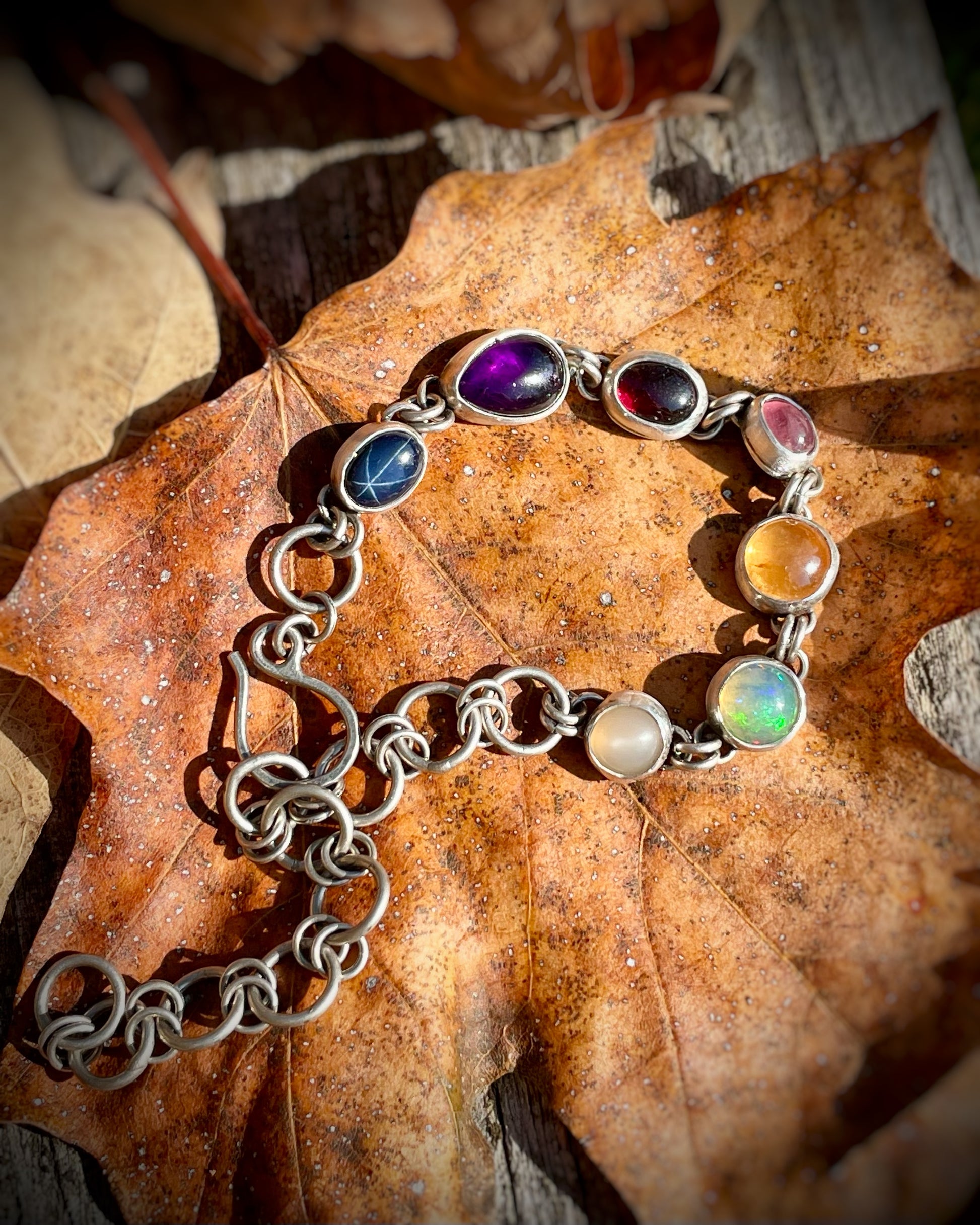 This handcrafted sterling silver link bracelet brings the warmth and richness of fall right to your wrist. Each genuine gemstone—Star Sapphire, Amethyst teardrop, Garnet, pink Tourmaline, Tangerine Garnet, Opal, and peach Moonstone—was chosen for its natural vibrancy and soft glow, echoing the shifting light and color of the season.