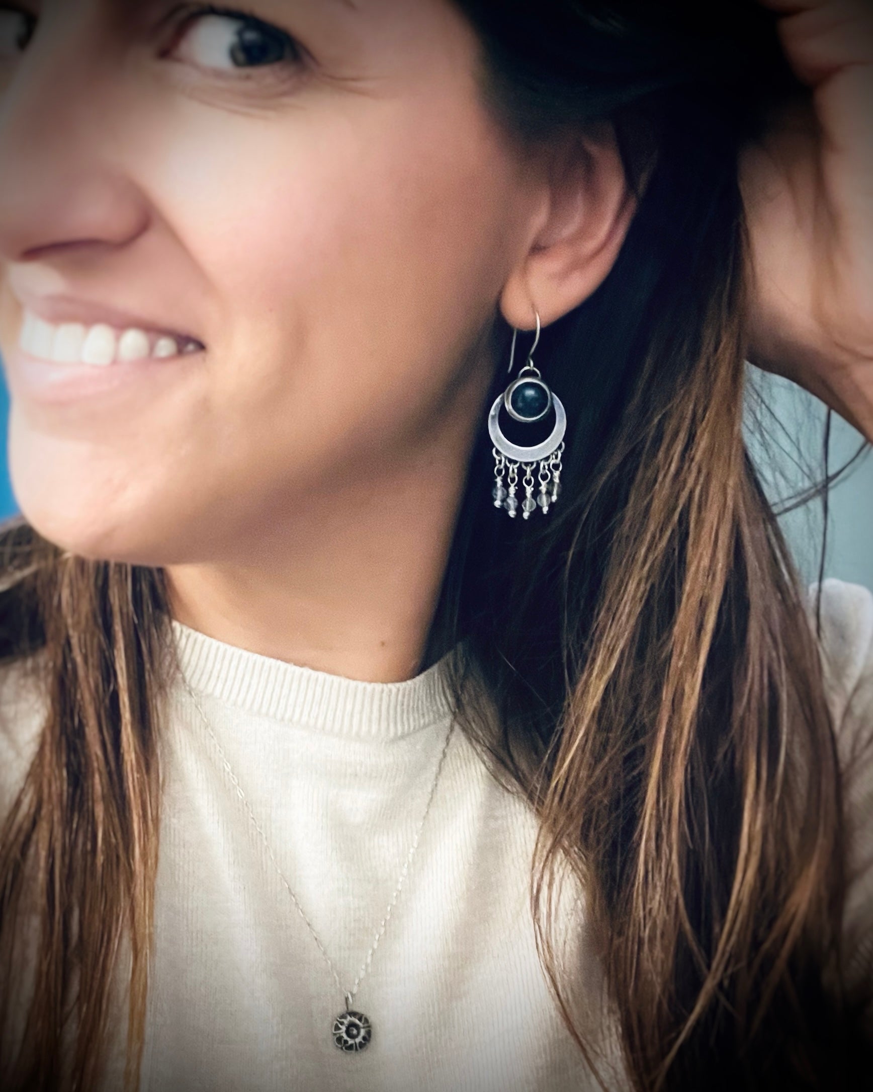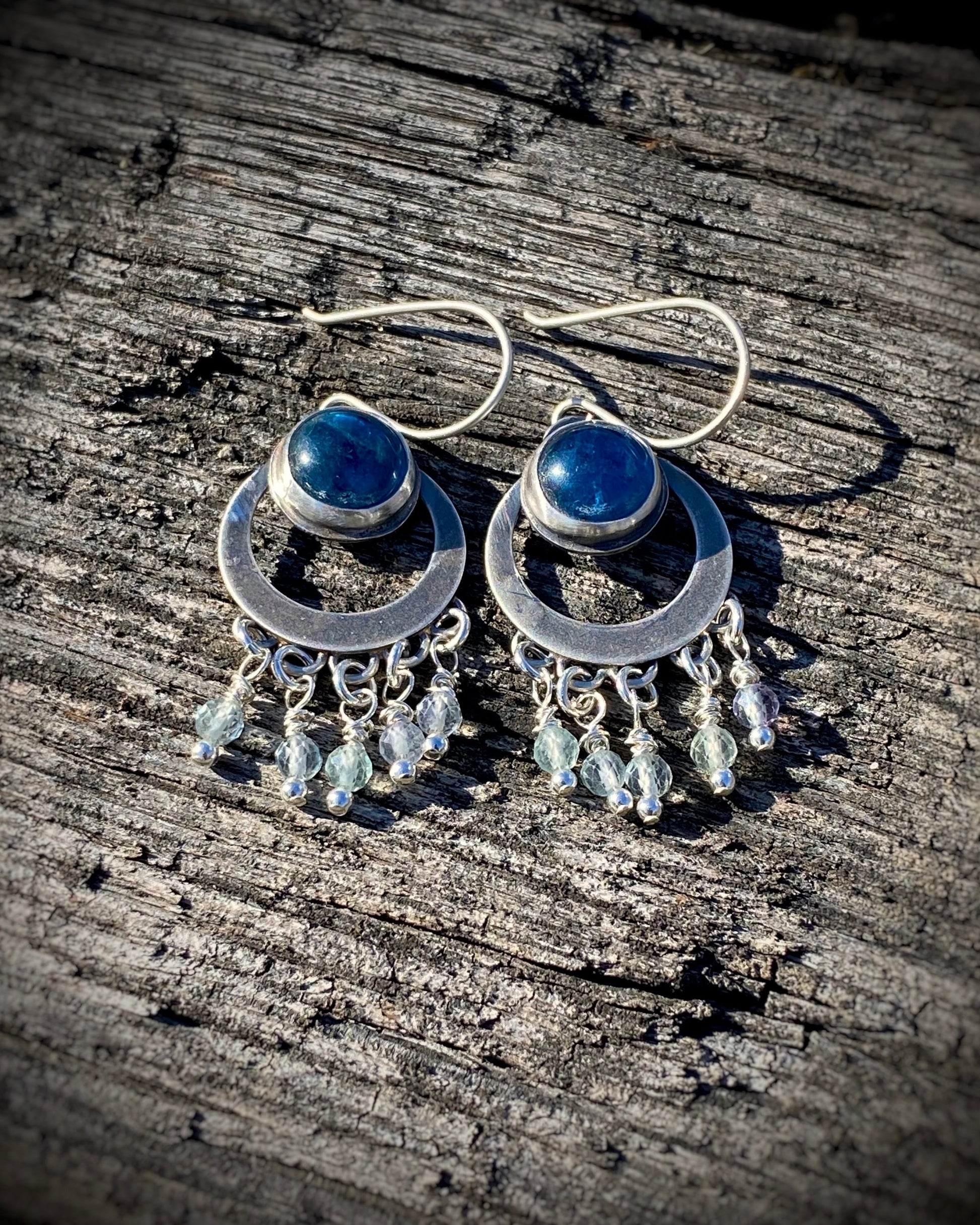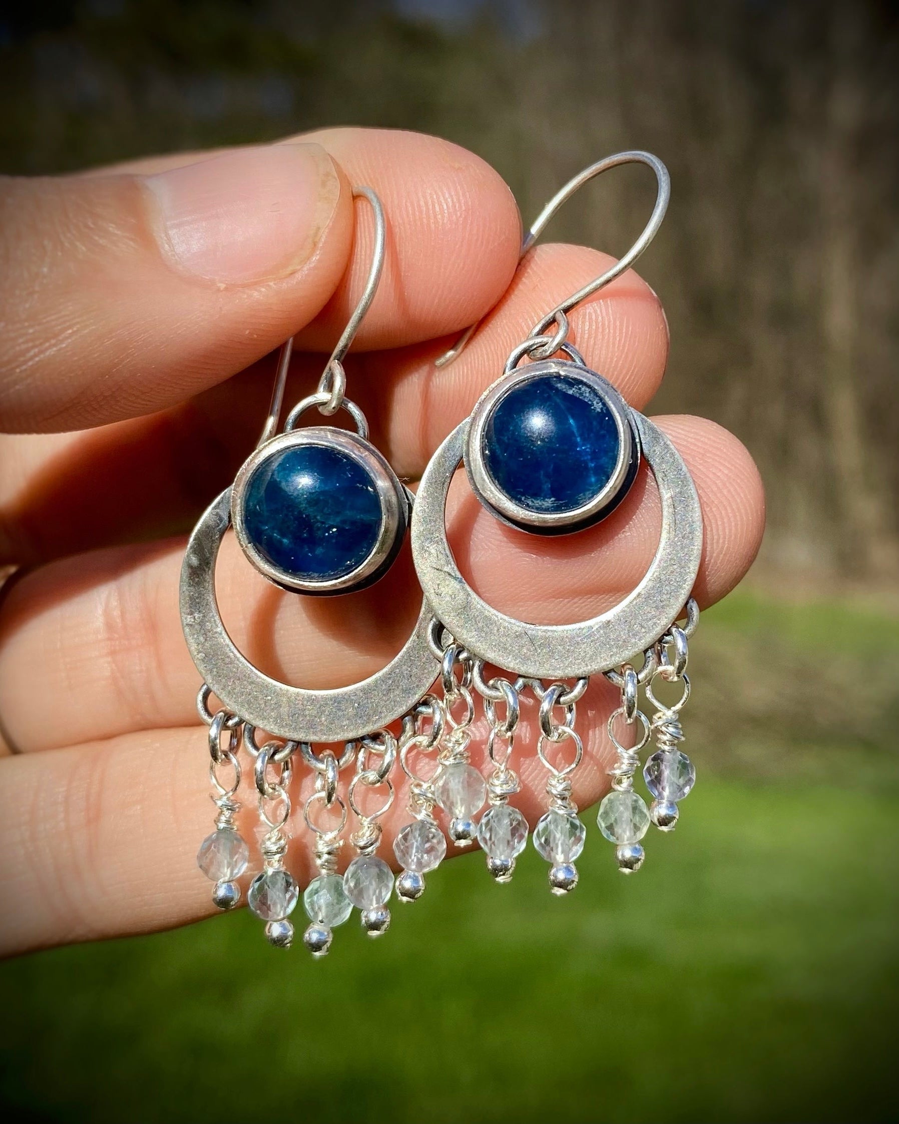 Super sweet and full of charm, these lightweight dangles offer just the right amount of movement. Deep blue Apatite stones are bezel-set in Sterling Silver with an antiqued finish, paired with rose-cut Fluorite beads that catch the light beautifully. Elegant, easy to wear, and perfect for adding a touch of color to any day.