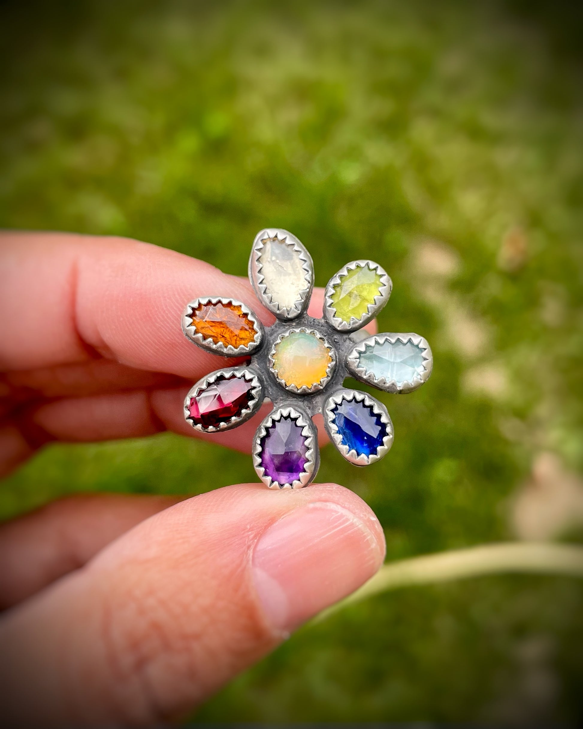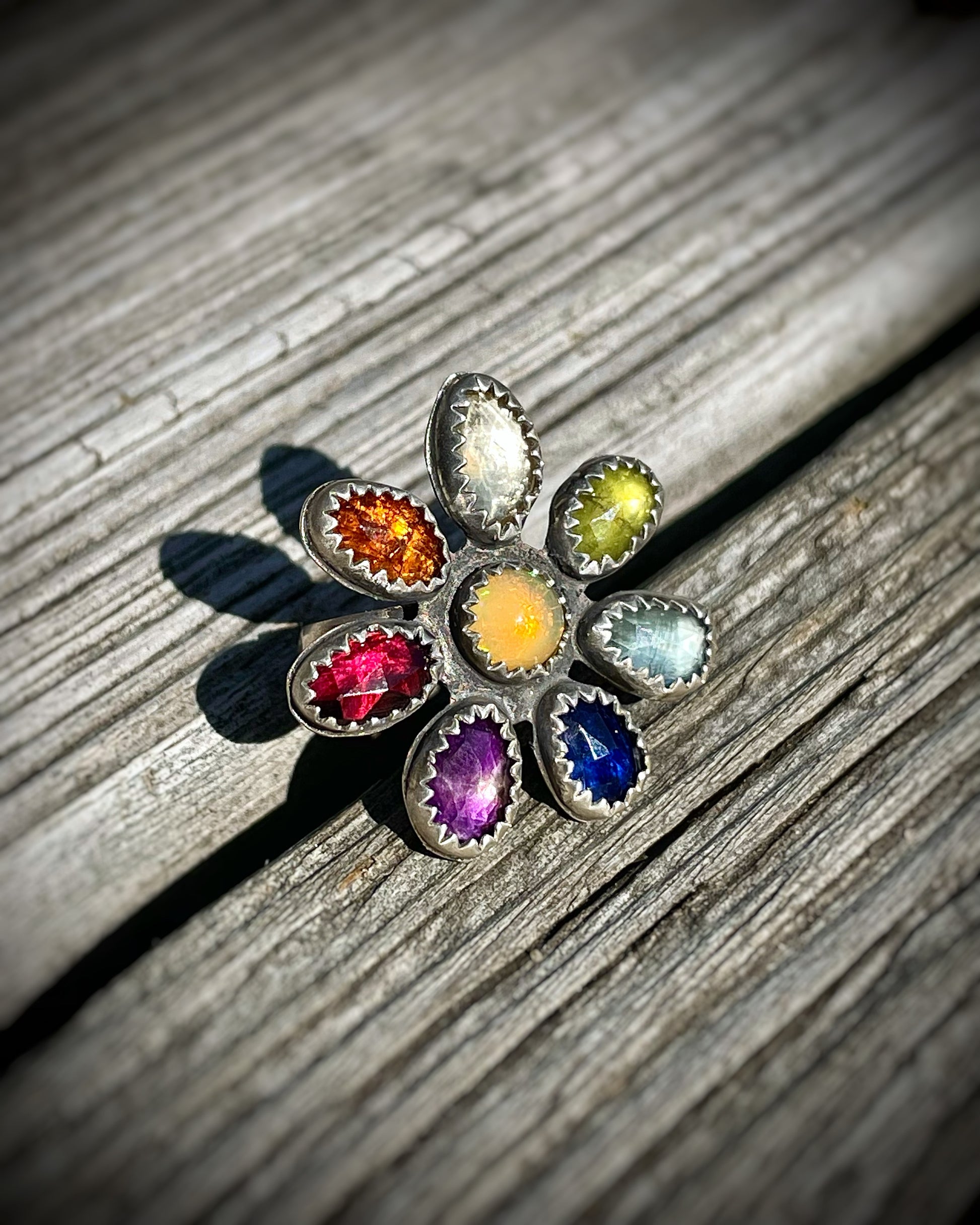 This Rainbow Bloom Statement Ring bursts with color and charm, bringing together a vibrant mix of gemstones in a bold floral design. Each petal features a rose-cut Garnet, Spessartine Garnet, Citrine, Vesuvianite, Aqua Kyanite, Traditional Kyanite, and Amethyst, while a smooth Opal cabochon shines at the center. All are set in sterling silver with a hand-applied antiqued, oxidized finish that enhances the depth and detail of the design.