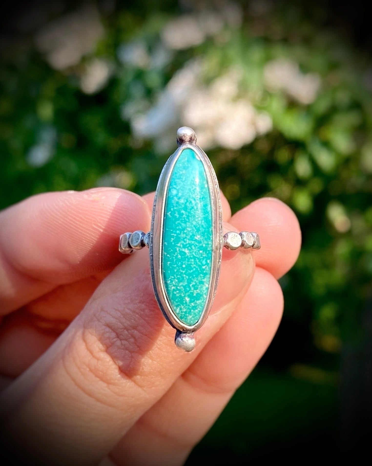 An oblong Fox Mine Turquoise stone is bezel-set in Sterling Silver, accented with recycled ball details and a hand-hammered beaded band. The soft hue of the stone contrasts beautifully with the antiqued oxidized finish, giving the piece a grounded, rustic elegance.