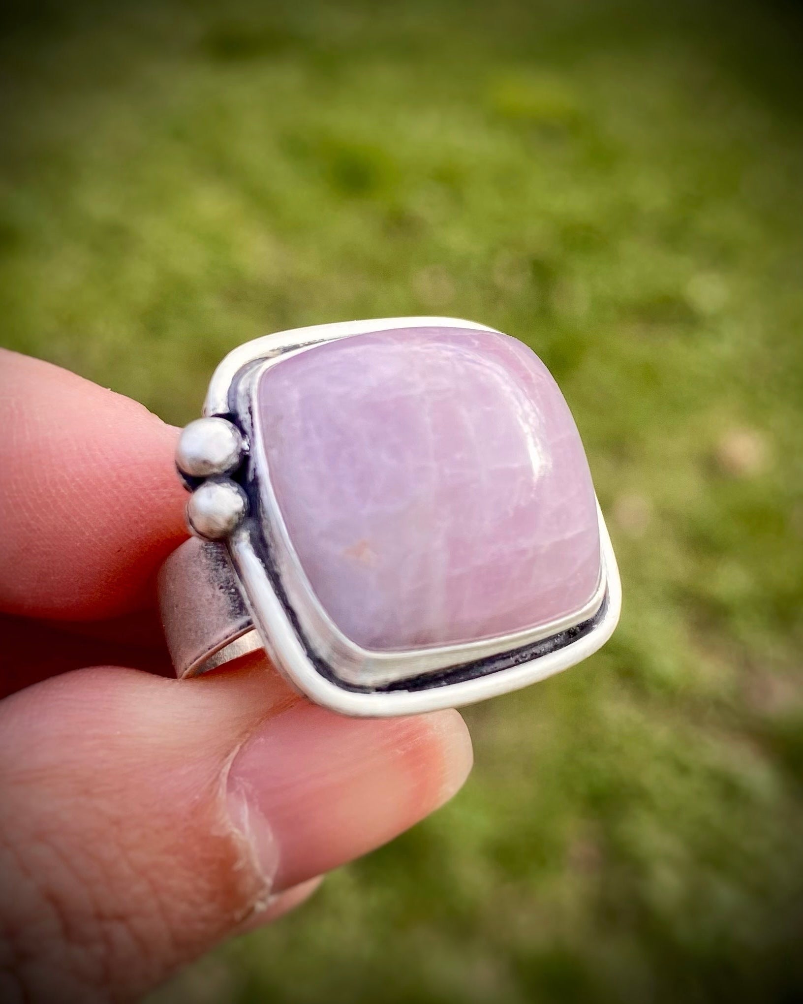 A soft, delicate pink Kunzite gemstone, cut in a square shape, is bezel-set in Sterling Silver with detailed border and subtle ball accents. The bold wide-band design adds balance and presence to this feminine stone. A beautifully grounded statement piece.