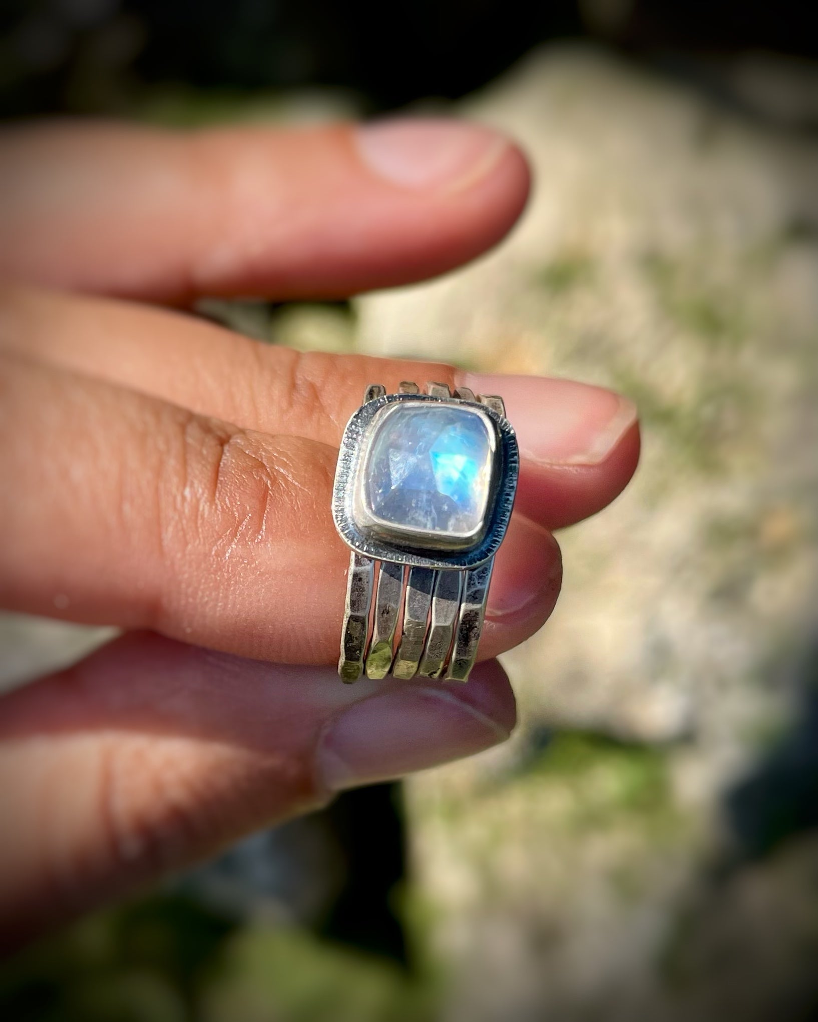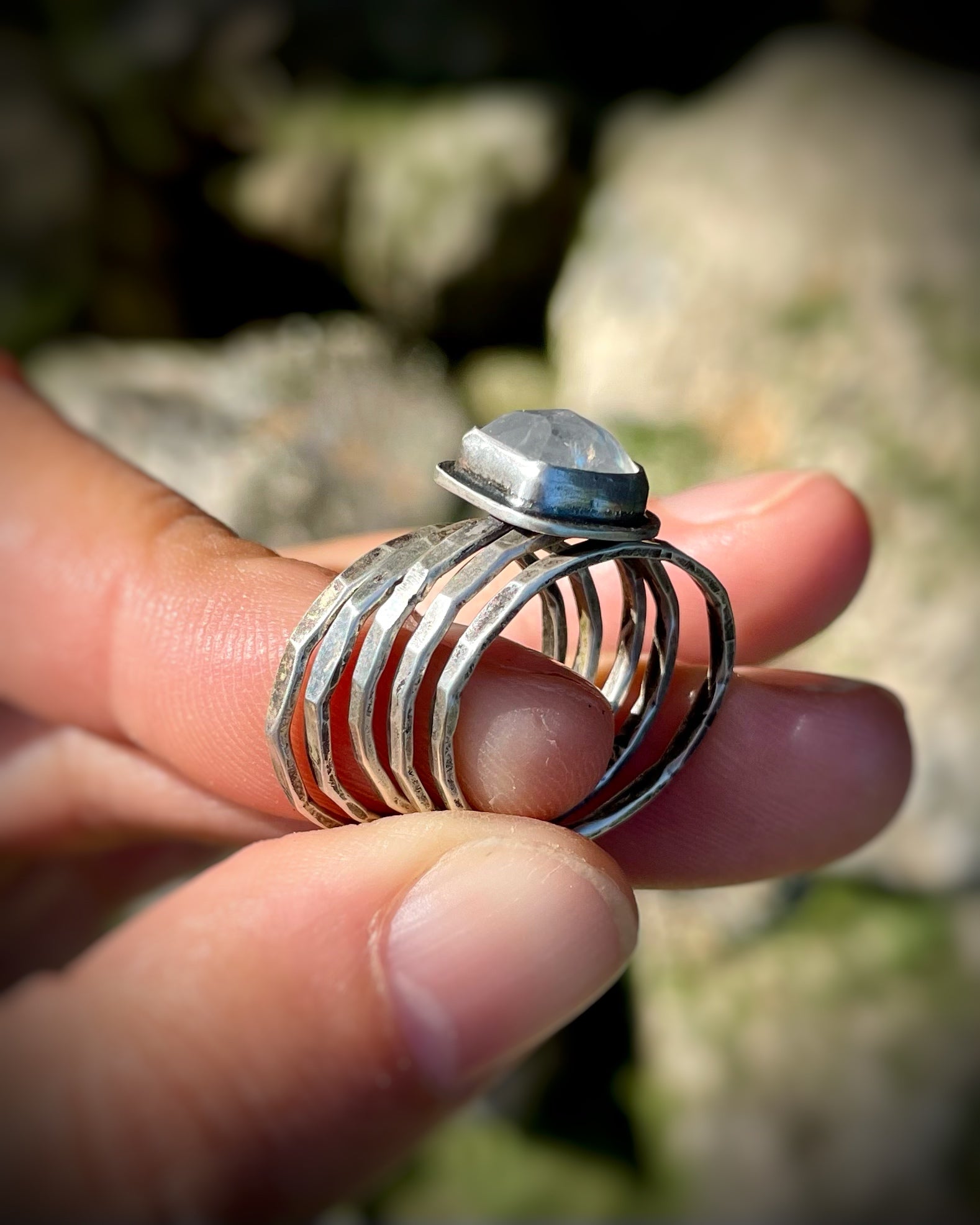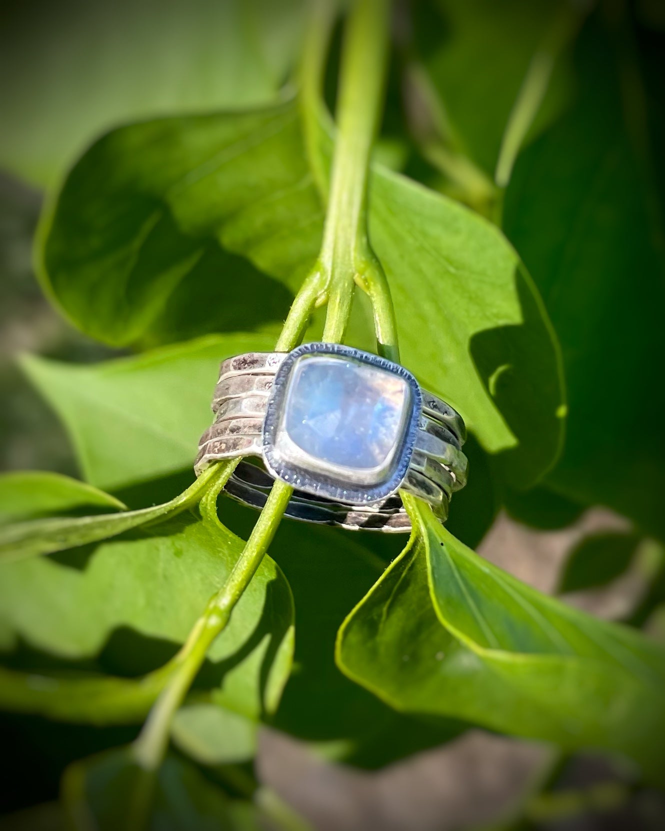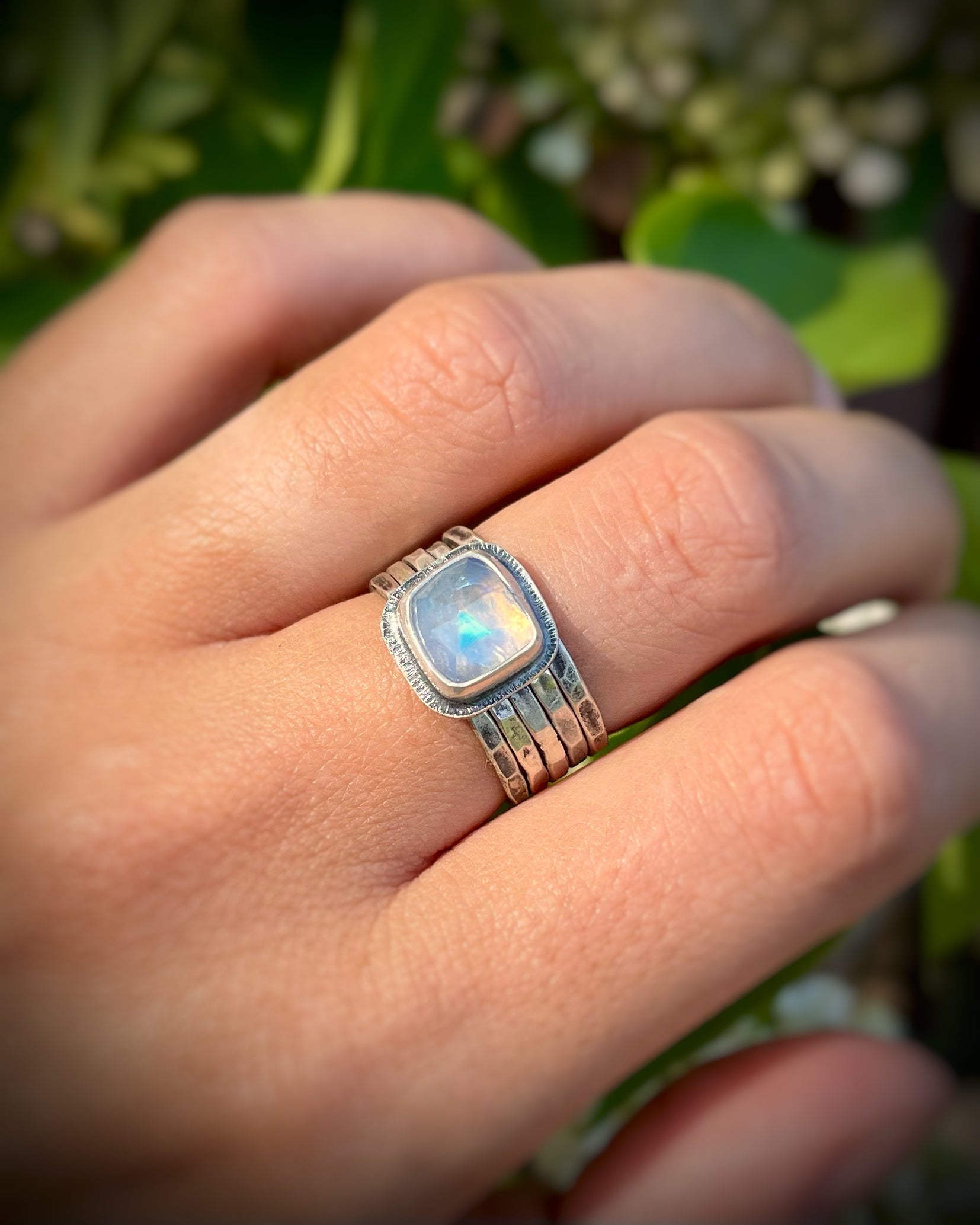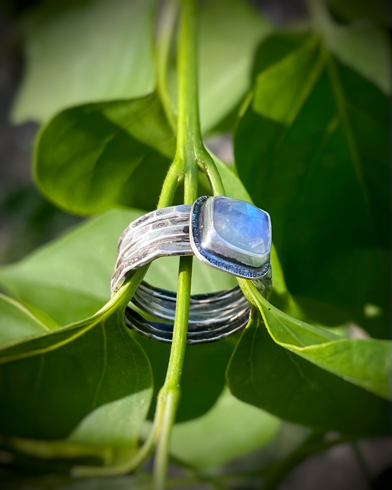 This Moon Glow Stacker Set includes five separate sterling silver bands, each hammered for texture and finished with an oxidized, hand-buffed patina. One of the five features a glowing rose-cut rainbow moonstone, full of blue flash and dreamy light play.