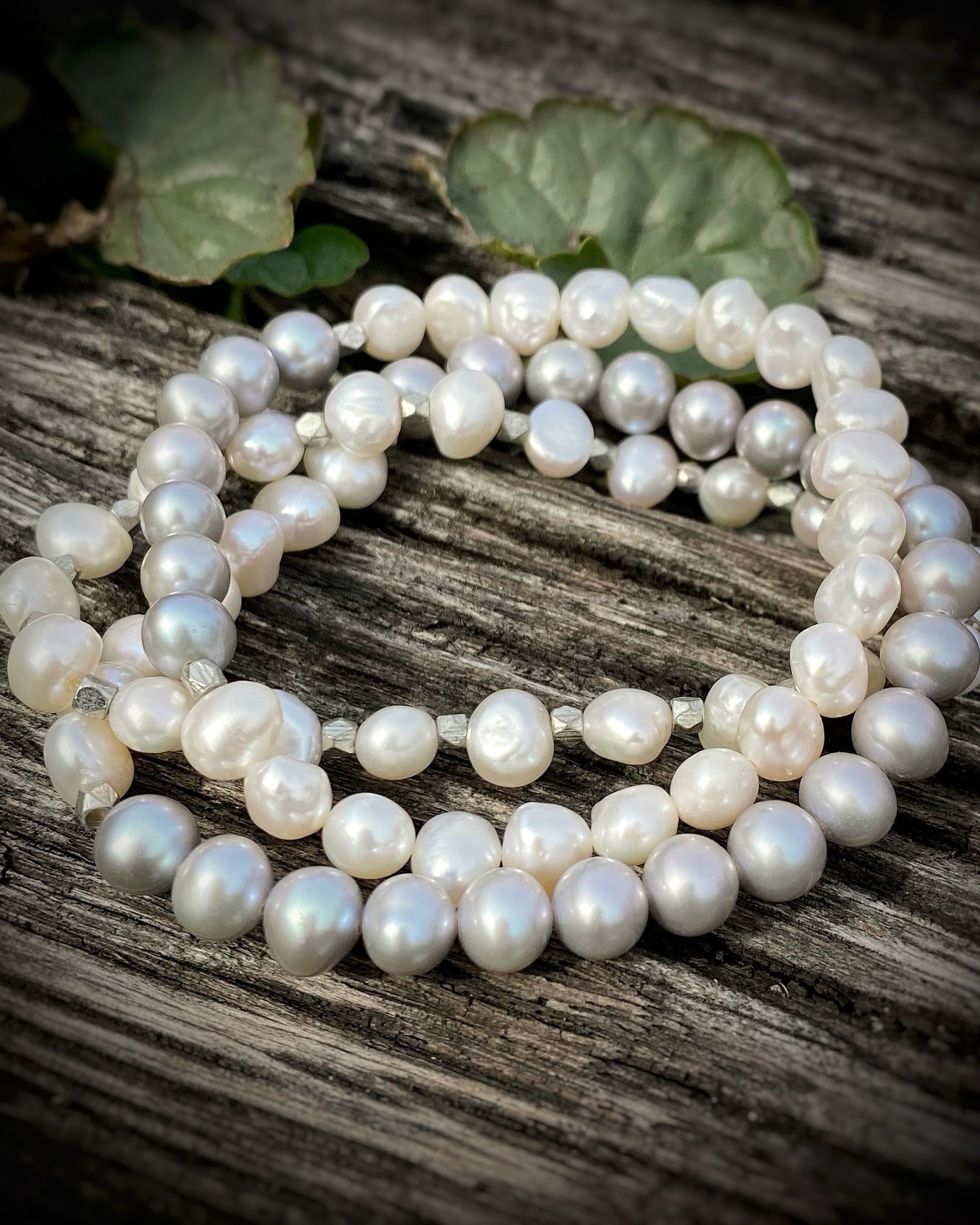 This set includes three stretchy bracelets made with a mix of white freshwater pearls and soft gray potato pearls, accented with small sterling silver divider beads for subtle contrast and shine.