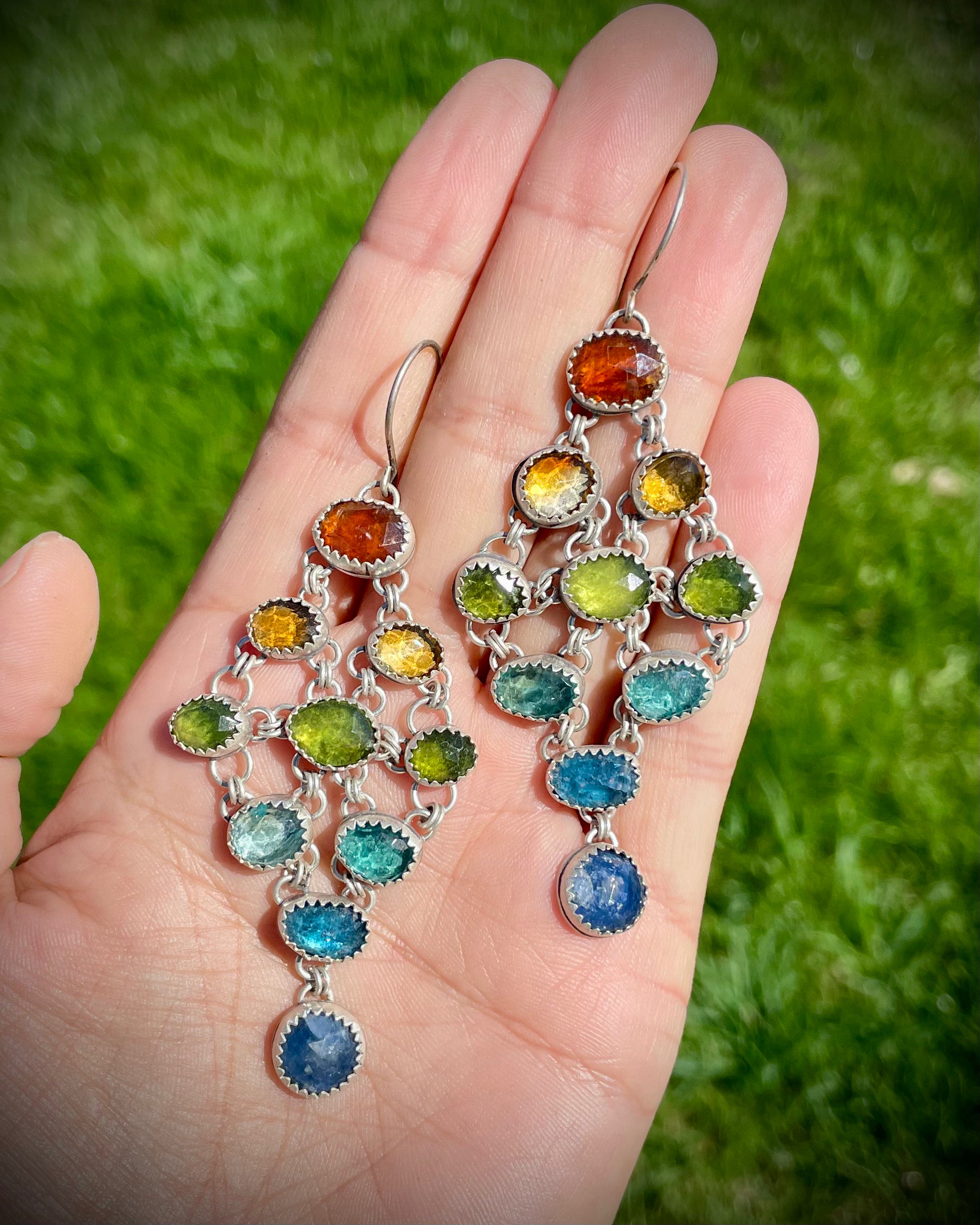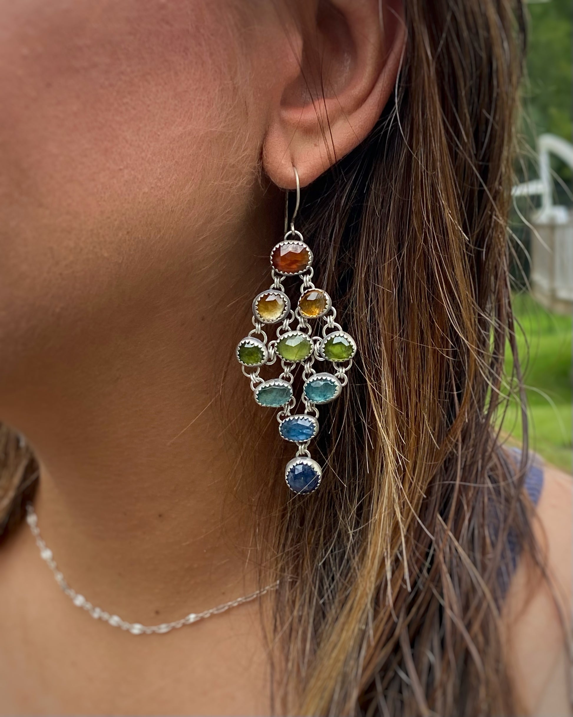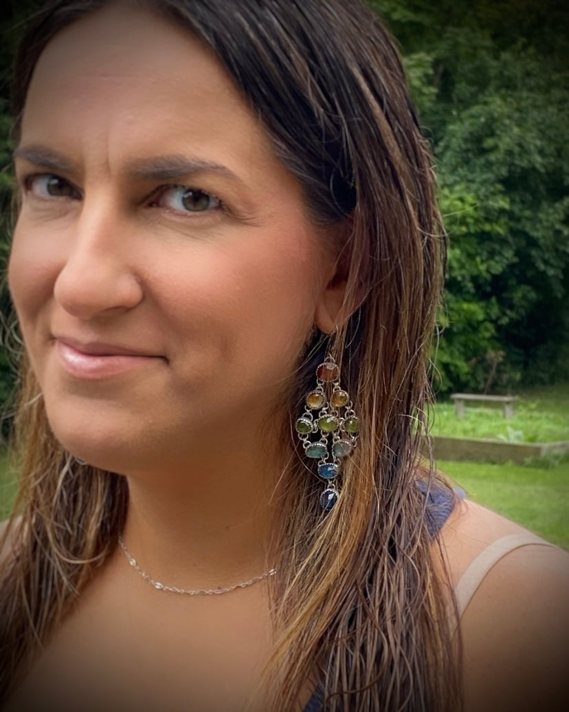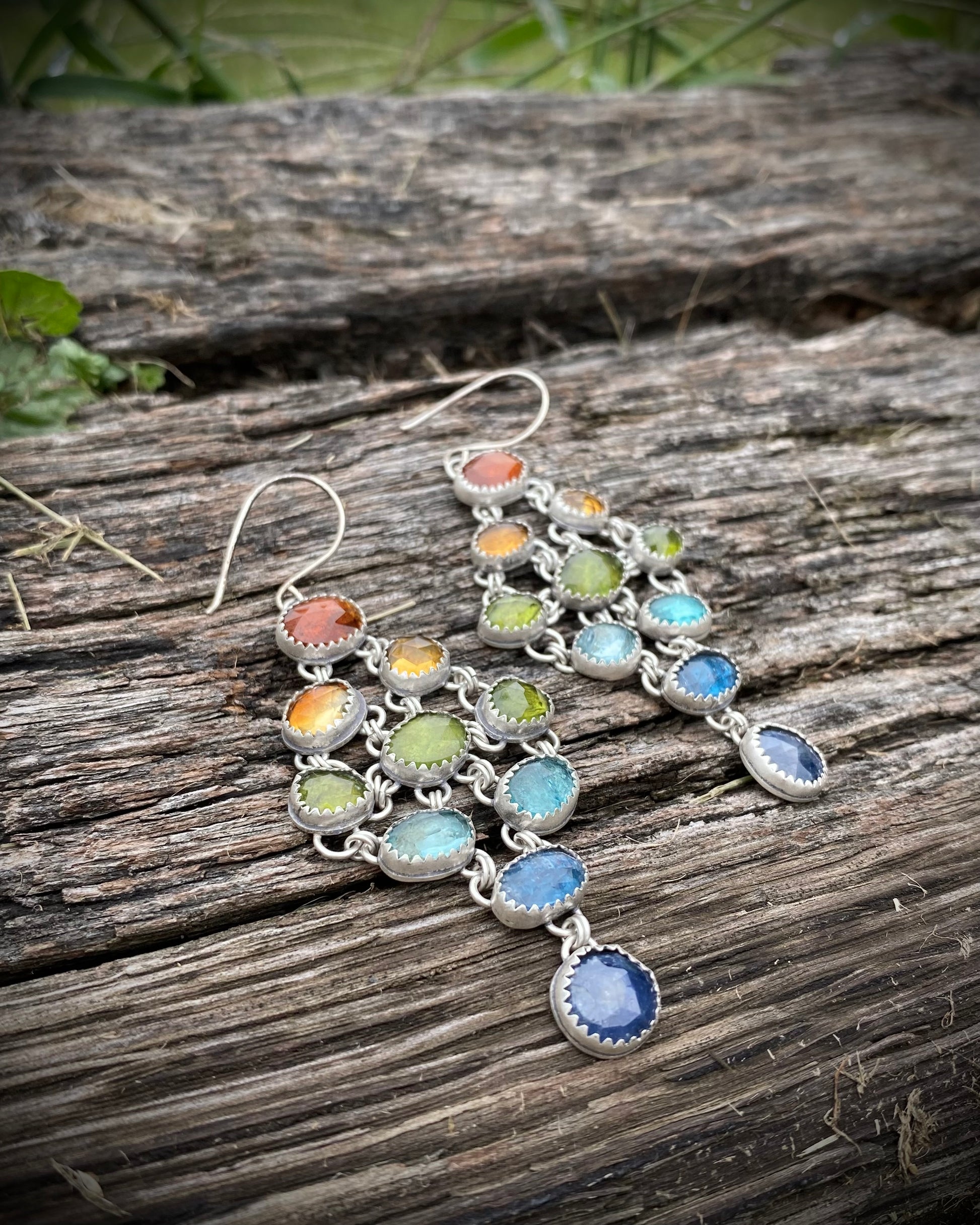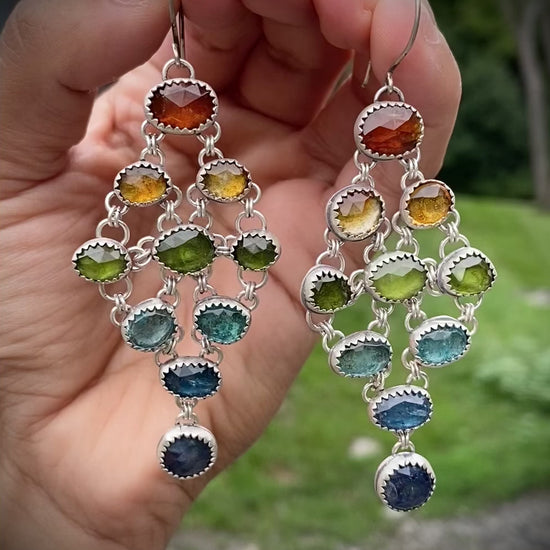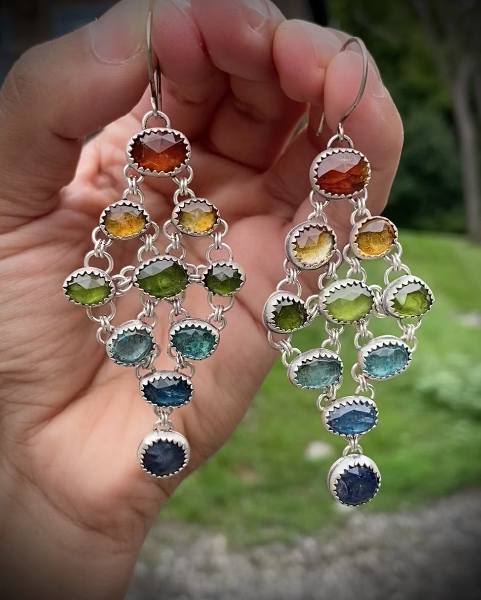 Vibrant and playful, these rainbow chandelier earrings feature a cascade of rose-cut gemstones—Orange Kyanite, Butterscotch Citrine, Vesuvianite, Apatite, Teal Kyanite, and Sapphire. Set in antiqued/oxidized Sterling Silver for understated depth. Each earring measures approximately 2.75” in length and weighs around 12 grams.