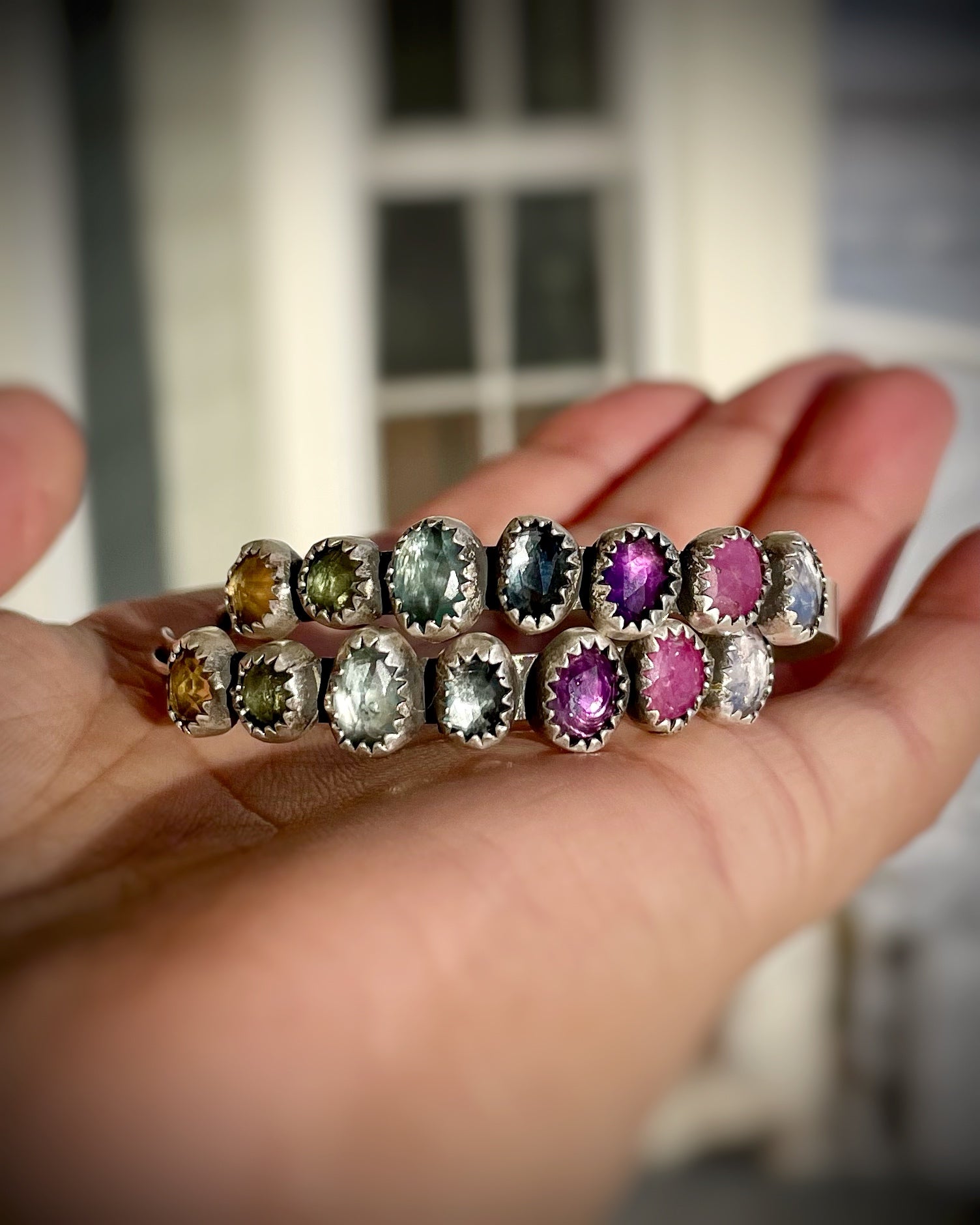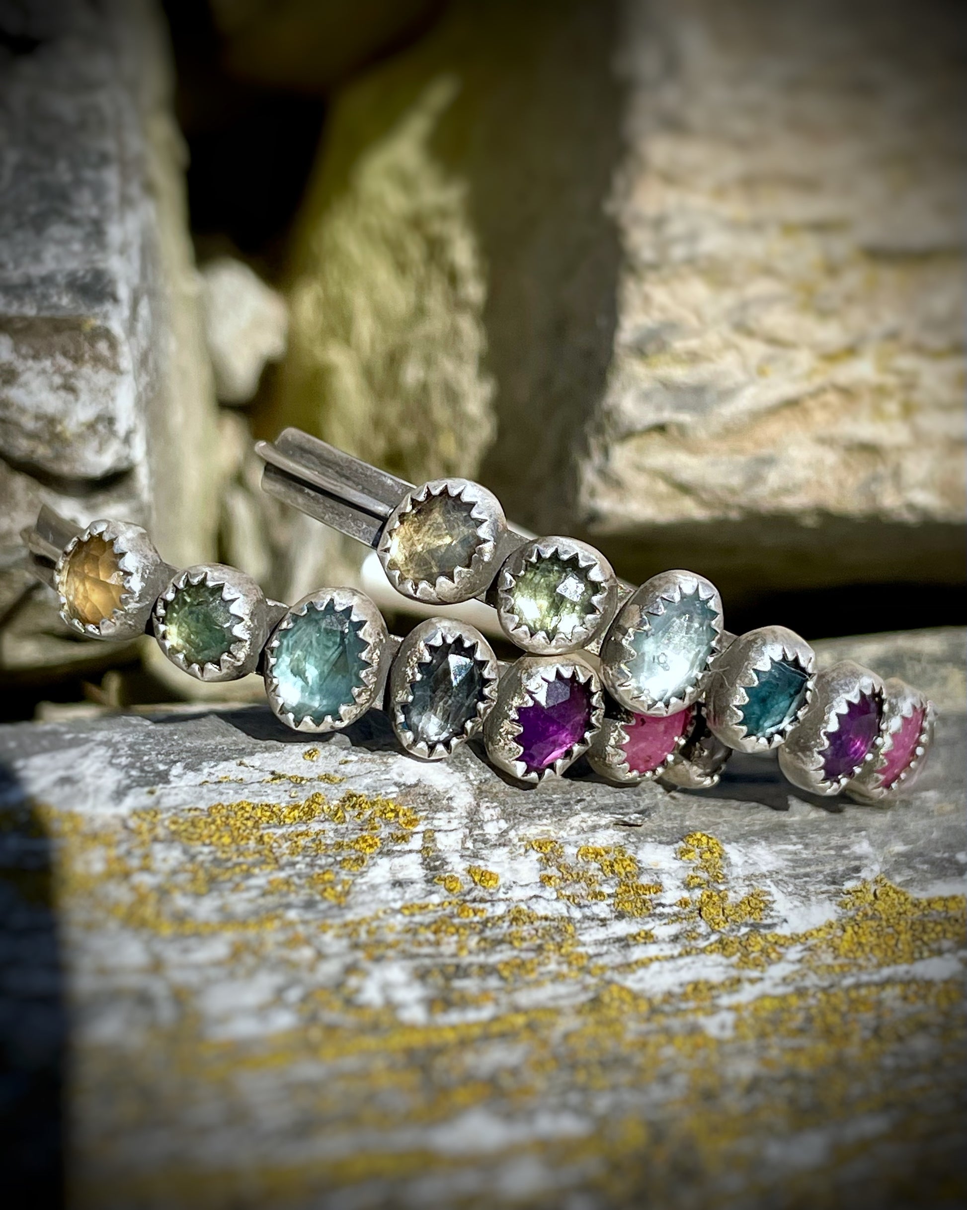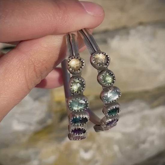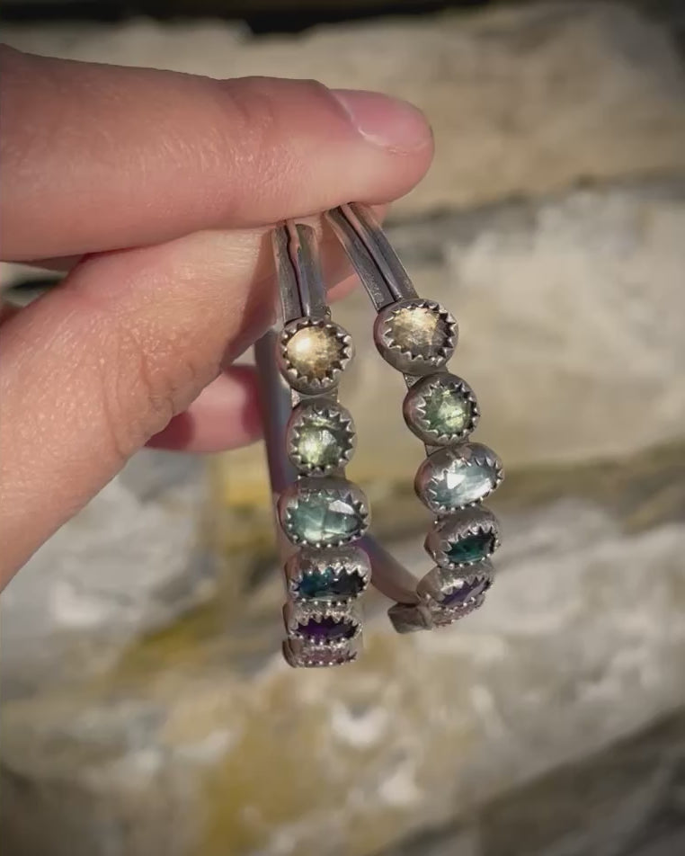 These beauties feature a curated mix of genuine rose-cut gemstones: citrine, green apatite, blue zircon, London blue topaz, amethyst, pink sapphire, and morganite. Each stone is individually set in sterling silver with an oxidized, antiqued finish that highlights the natural color variation and texture of the gems.