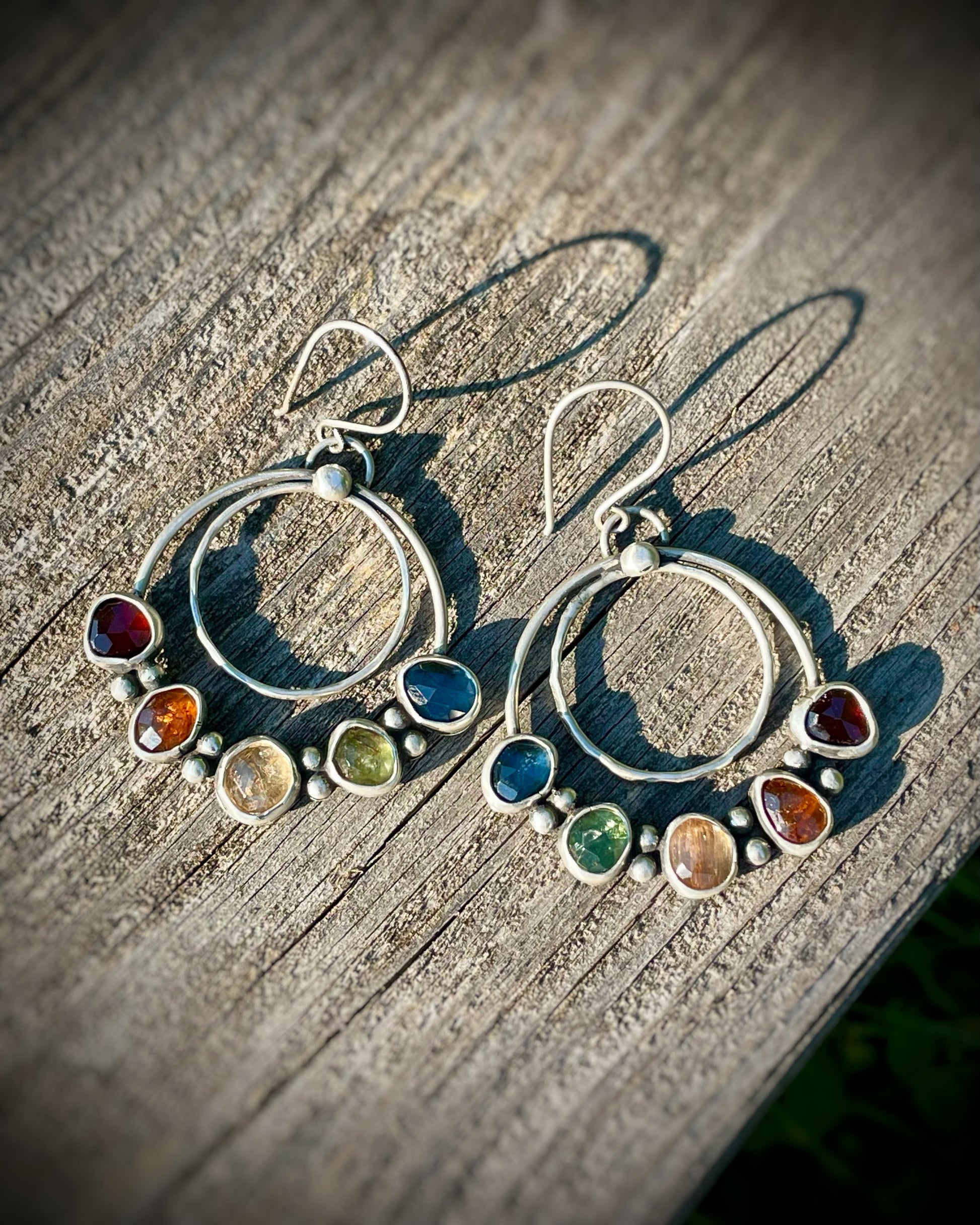 Each stone is hand-set in sterling silver and paired with a delicately hammered inner hoop for added texture and movement. The result? A playful, earthy, yet elegant design that captures the magic of the rainbow.