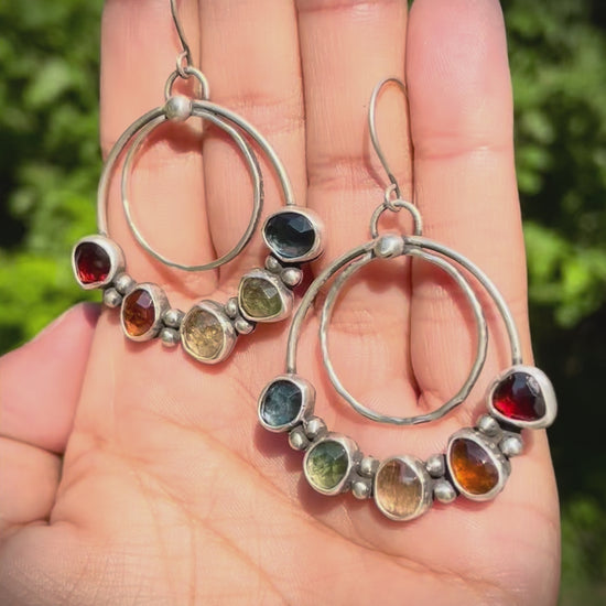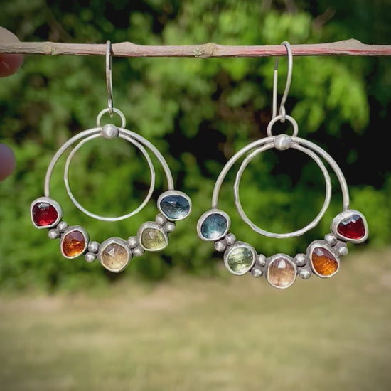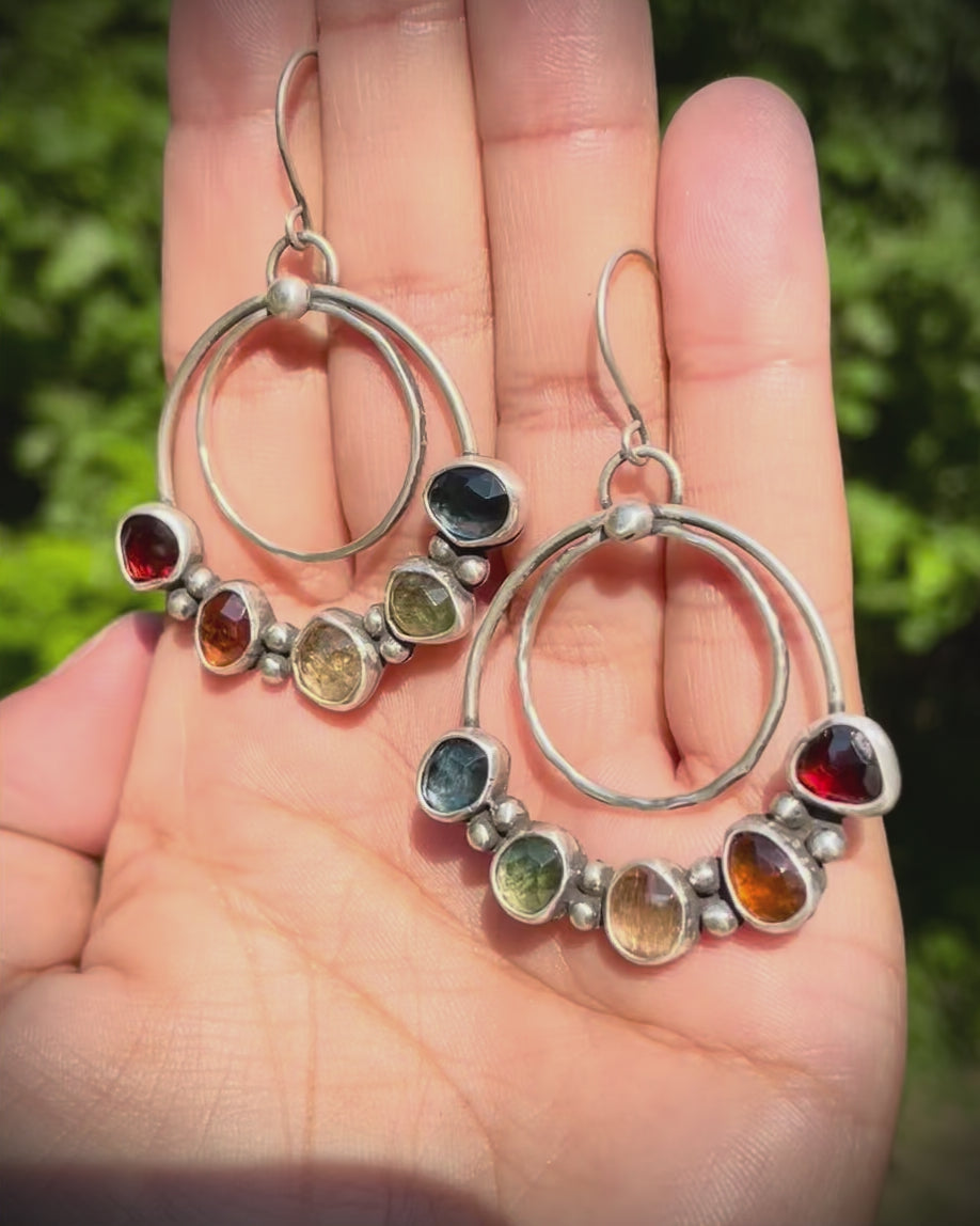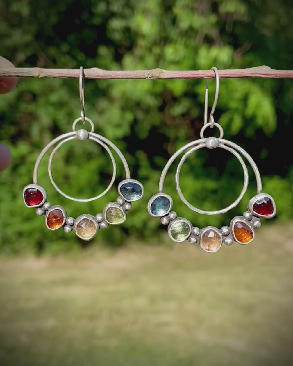 The Rainbow Solstice Hoops bring a pop of color and artisanal charm to any look. These radiant earrings feature a shimmering blend of ethically sourced gemstones: rich rose-cut Garnet, fiery Orange Kyanite, golden Imperial Topaz, fresh Green Apatite, and deep London Blue Topaz.