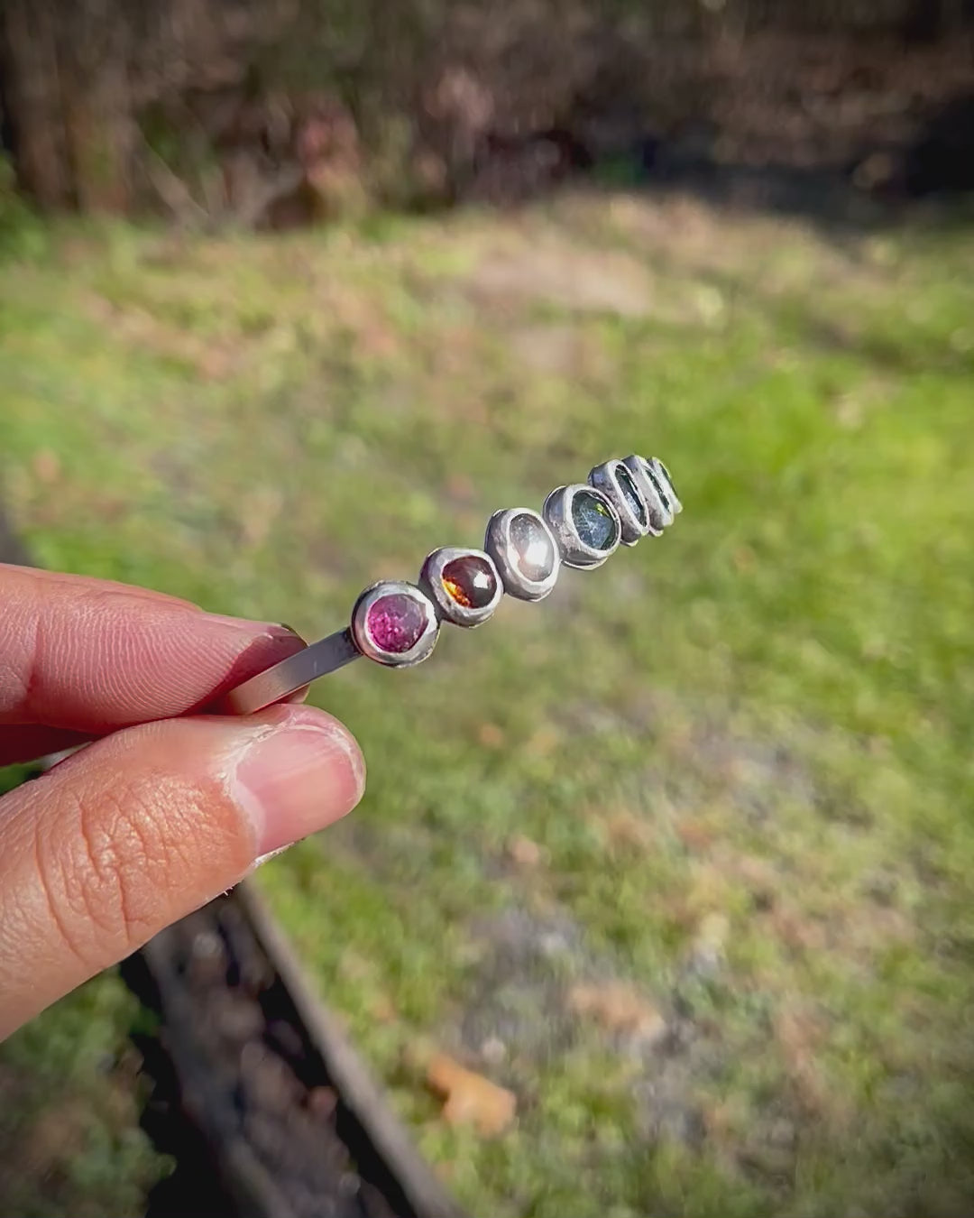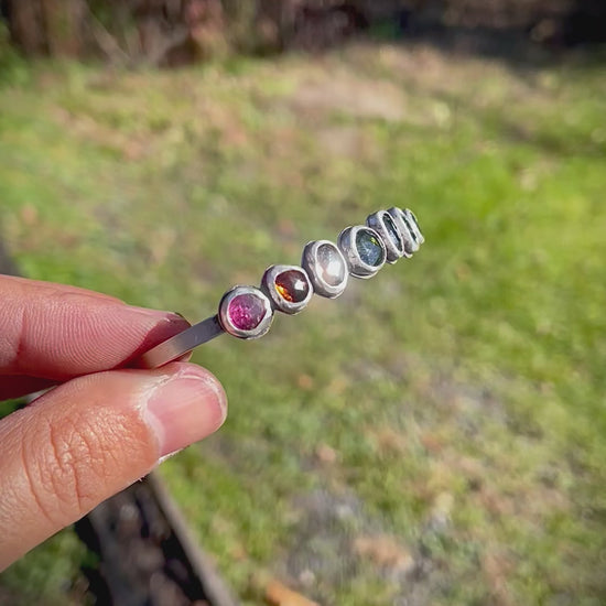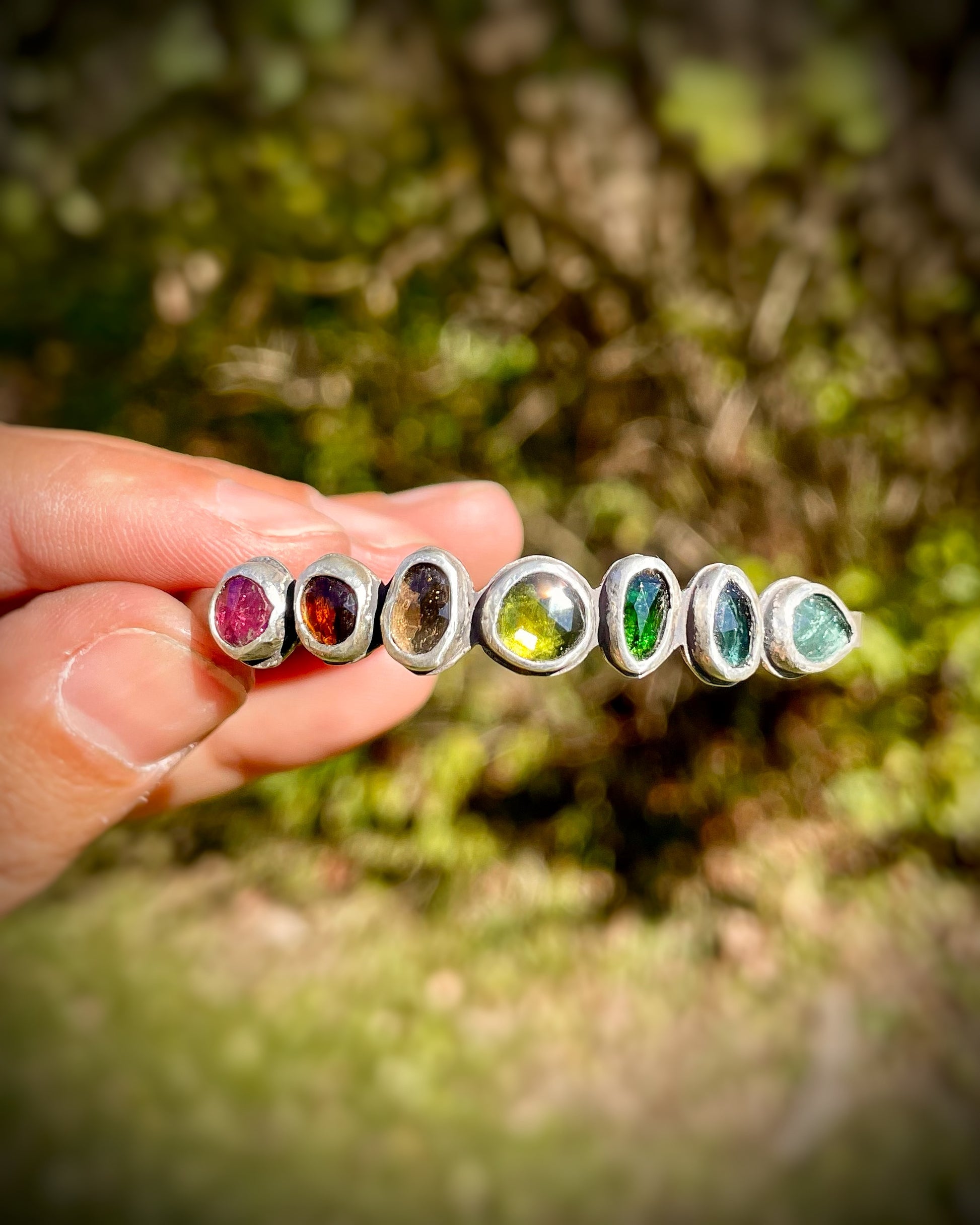 This handcrafted cuff is set with rose-cut Tourmalines in a full spectrum of colors—from deep pinks and warm ambers to bright greens and cool blue-greens. Each stone is one of a kind, and each bezel is shaped by hand, giving the piece its organic, sculpted look.